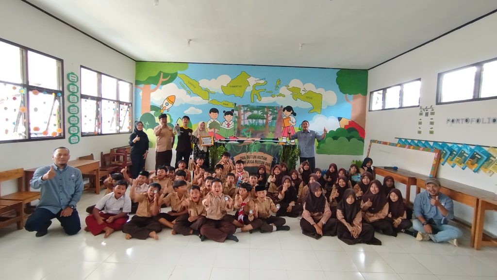 Disana, teman-teman fasilitator menampilkan cerita yang diambil dari buku cerita anak berjudul “Owa Butuh Hutan, Hutan Juga Butuh Owa” yang ditulis oleh Kak Rahayu Oktaviani dari Yayasan Kiara. Cerita disampaikan melalui media wayang yang menarik. Terlihat sebanyak 41 teman cilik dari SDN Babakan Kencana dan 38 teman cilik dari SDN 2 Cicurug begitu antusias menyimak pagelaran wayang owa yang dibawakan teman-teman fasilitator.